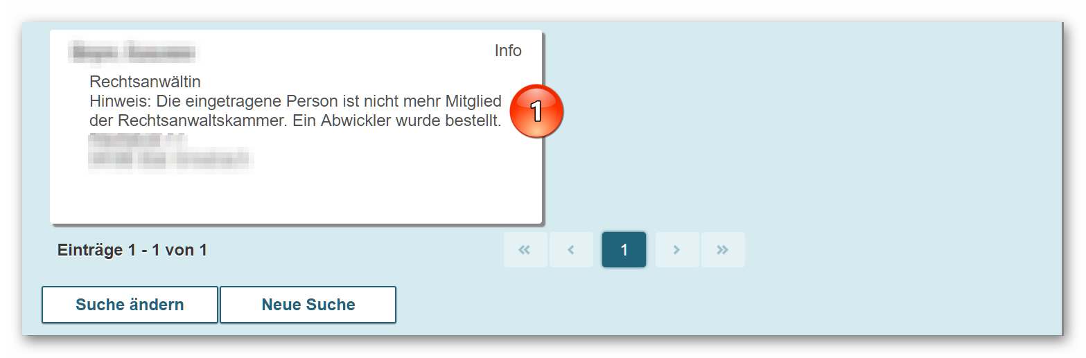 In § 5 RAVPV sind weitere Details geregelt, etwa, dass die Löschung des Postfachs im Regelfall spätestens zwei Jahre nach der Sperrung erfolgt. Zudem wird klargestellt, dass der Eintrag im Gesamtverzeichnis während der Sperrung des Postfachs nicht mehr angezeigt werden darf. Eine Ausnahme besteht lediglich dann, wenn die örtliche Rechtsanwaltskammer einen Abwickler für die Kanzlei bestellt hat. Dann vermerkt sie im Verzeichnis, dass die eingetragene Person nicht mehr Mitglied der Rechtsanwaltskammer ist und dass ein Abwickler bestellt wurde (1).