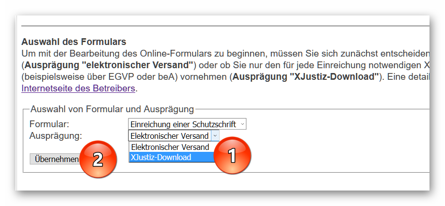 2. Rufen Sie das Onlineformular auf. Wählen Sie die Option „XJustiz Download“ aus (1) und klicken Sie auf „Übernehmen“ (2).
