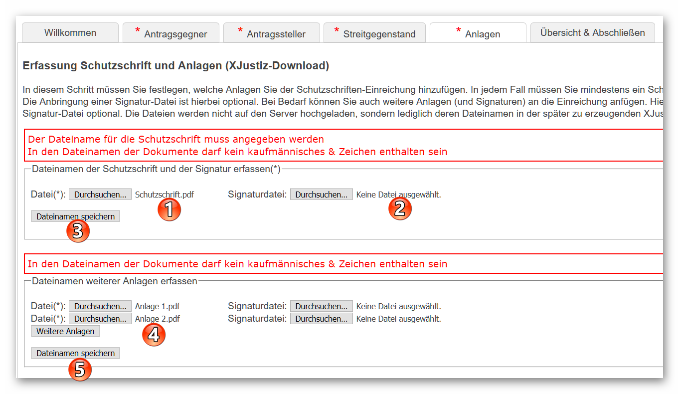 3. Bearbeiten Sie nun das Formular, indem Sie die Felder in den Registern "Antragsgegner", "Antragsteller" und "Streitgegenstand" befüllen. Im Register „Anlagen“ klicken Sie im Feld „Schutzschrift“ auf „Durchsuchen“ (1) und wählen am entsprechenden Speicherort die vorbereitete Datei mit der Schutzschrift aus. Das Feld „Signaturdatei“ können Sie bei dem Versand als Anwalt aus ihrem beA leer lassen (2). Bestätigen Sie mit „Dateinamen speichern“ (3). Es wird keine Datei hochgeladen, sondern nur der Dateiname im Datensatz vermerkt. Verfahren Sie gleichermaßen mit etwaigen Anlagen zu Ihrer Schutzschrift. Mit dem Button „Weitere Anlagen“ (4) können mehrere Felder hinzugefügt werden. Schließen Sie mit „Dateinamen speichern“ ab (5). Im letzten Register haben Sie die Möglichkeit zum Download der erzeugten xJustiz-Datei.