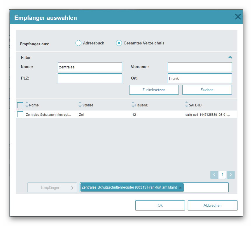 4. Erstellen Sie in Ihrem beA eine neue Nachricht und suchen Sie über den Namen „Zentrales Schutzschriftenregister“ und den Ort „Frankfurt“ das Zentrale Schutzschriftenregister, um es als Empfänger hinzufügen zu können. Achten Sie darauf, dass Sie im Gesamtverzeichnis suchen (vgl. beA-Newsletter 19/2018) und nicht versehentlich in Ihrem persönlichen Adressbuch – dort finden Sie das Schutzschriftenregister nämlich nur, wenn Sie es zuvor selbst dort abgelegt haben.