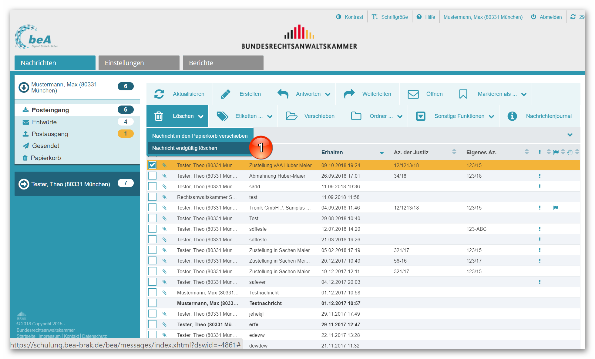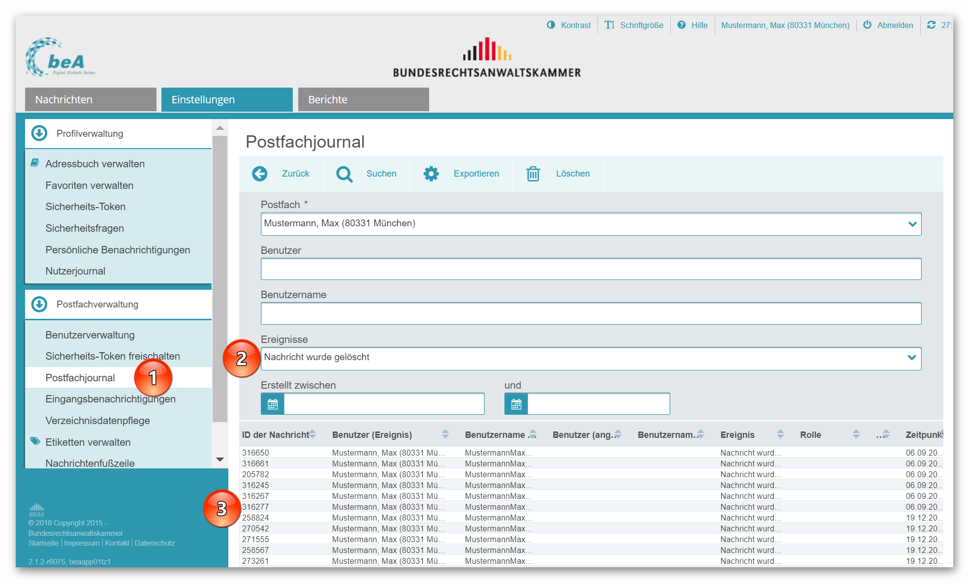 Wird eine Nachricht gelöscht, dann protokolliert das beA-System diesen Vorgang im sog. Postfachjournal, und zwar einschließlich der Nachrichten-ID. So wird nachvollziehbar, welche Nachrichten gelöscht wurden. Wechseln Sie dazu in den Einstellungen bzw. in der Postfachverwaltung auf das Postfachjournal (1). Suchen Sie nach dem Ereignis „Nachricht wurde gelöscht“ (2) und Sie erhalten sofort eine Übersicht, welche Nachrichten (mit welcher Nachrichten-ID) zu welchem Zeitpunkt von welcher Person gelöscht wurden (3).