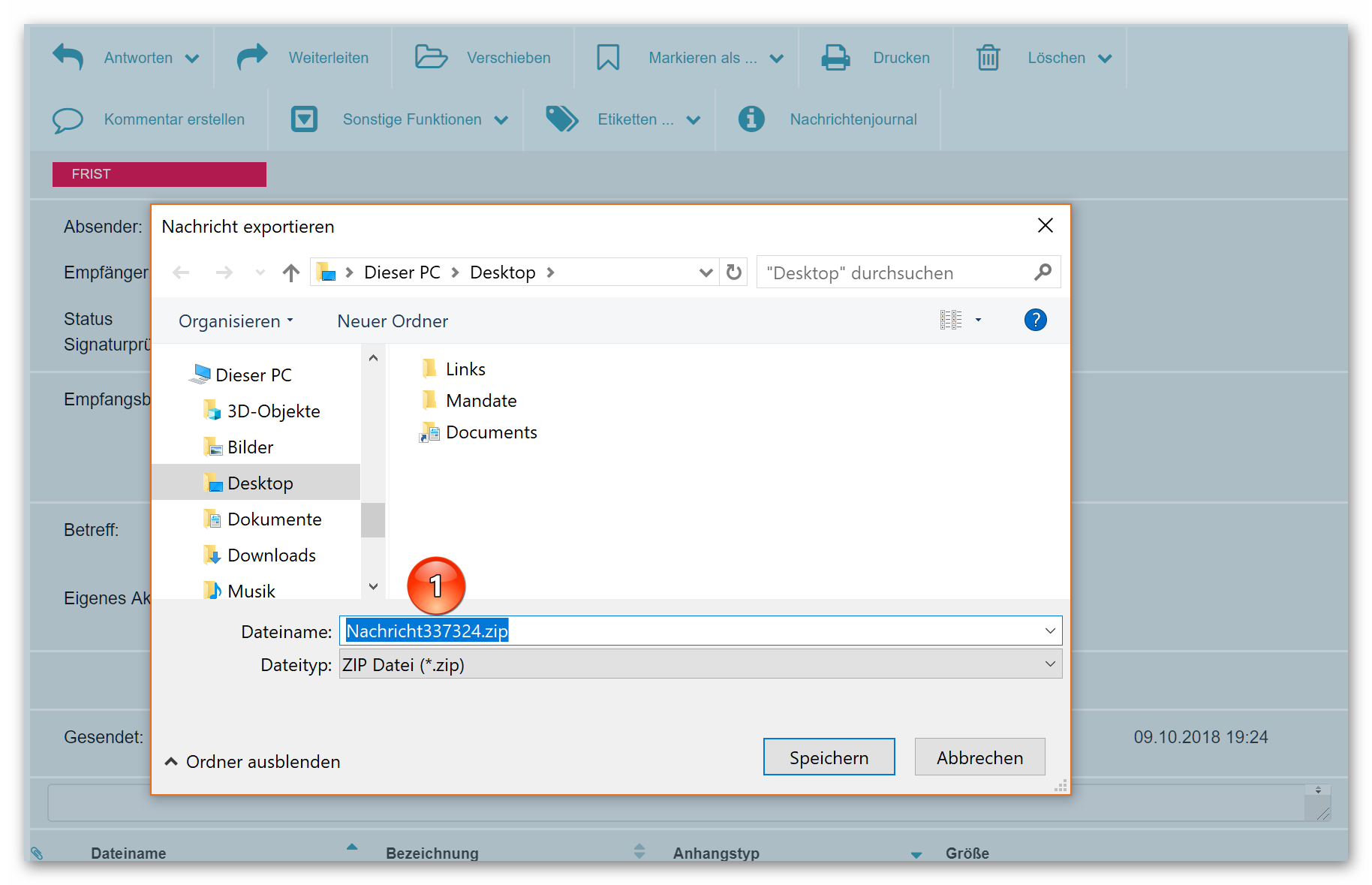 Wenn eine Nachricht in Ihrem Postfach eingegangen ist oder Sie eine versandt haben, empfiehlt es sich, sie zeitnah auf Ihr lokales System zu exportieren (zum Export: beA-Newsletter 17/2018). Schon bei der Vergabe des Dateinamens für die Exportdatei wird eine sog. Nachrichten-ID (1) vorgeschlagen.