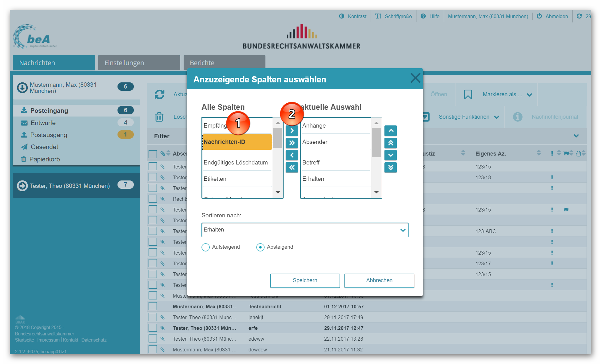 Diese Nachrichten-ID stellt eine fortlaufende Nummerierung aller beA-Nachrichten dar und dient zu deren Identifizierung (das ist z.B. für eine eindeutige Zuordnung auf dem Versandweg nötig). Sie findet sich nicht nur in dem Exportordner an diversen Stellen wieder. Vielmehr kann Sie über die Spaltenkonfiguration (vgl. hierzu etwa beA-Newsletter 23/2018) jederzeit in der Nachrichtenübersicht als zusätzliches Datenfeld eingeblendet werden, indem sie in der linken Spalten ausgewählt (1) und mit dem Pfeil nach rechts (2) in die aktuelle Auswahl genommen wird.