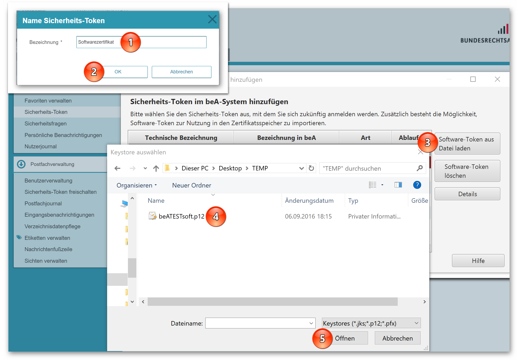 Vergeben Sie eine beliebige Bezeichnung für Ihren neuen Token, z.B. ganz schlicht „Softwarezertifikat“ (1) und bestätigen Sie mit „OK“ (2). Innerhalb der beA Client Security klicken Sie auf den Button „Software-Token aus Datei laden“ (3). Wählen Sie das auf Ihrem System gespeicherte Software-Zertifikat aus (4) und klicken Sie auf „Öffnen“ (5).