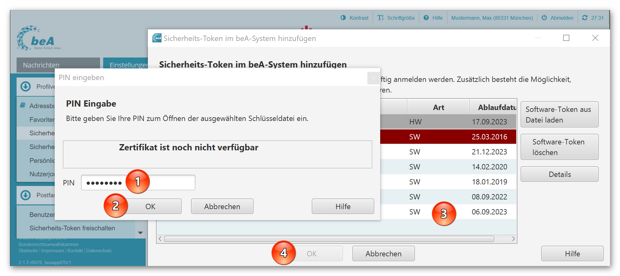 Geben Sie die Transport-PIN zu Ihrem Softwarezertifikat ein (1) und bestätigen Sie mit „OK“ (2). Im Anschluss haben Sie die Möglichkeit, eine neue PIN für die tägliche Anmeldung zu hinterlegen. Dann wird das Zertifikat in der beA Client Security gespeichert und Sie können es auswählen (3). Schließen Sie mit „OK“ ab (4).