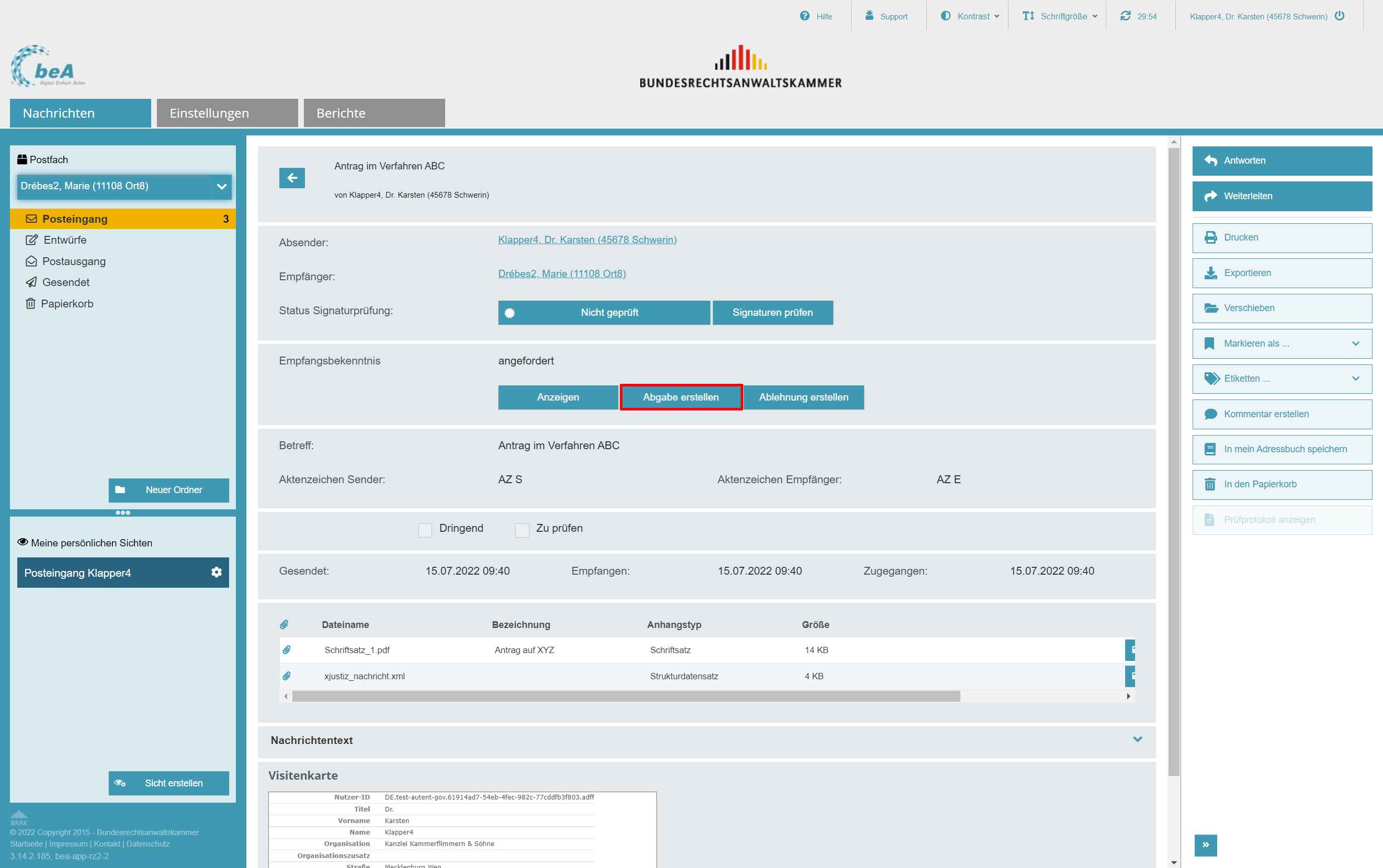 Die Empfängerin oder der Empfänger kann das abgegebene eEB in seinem Postfach öffnen. In der Visitenkarte wird bestätigt, dass die Abgabe durch eine Vertretung erfolgt ist.