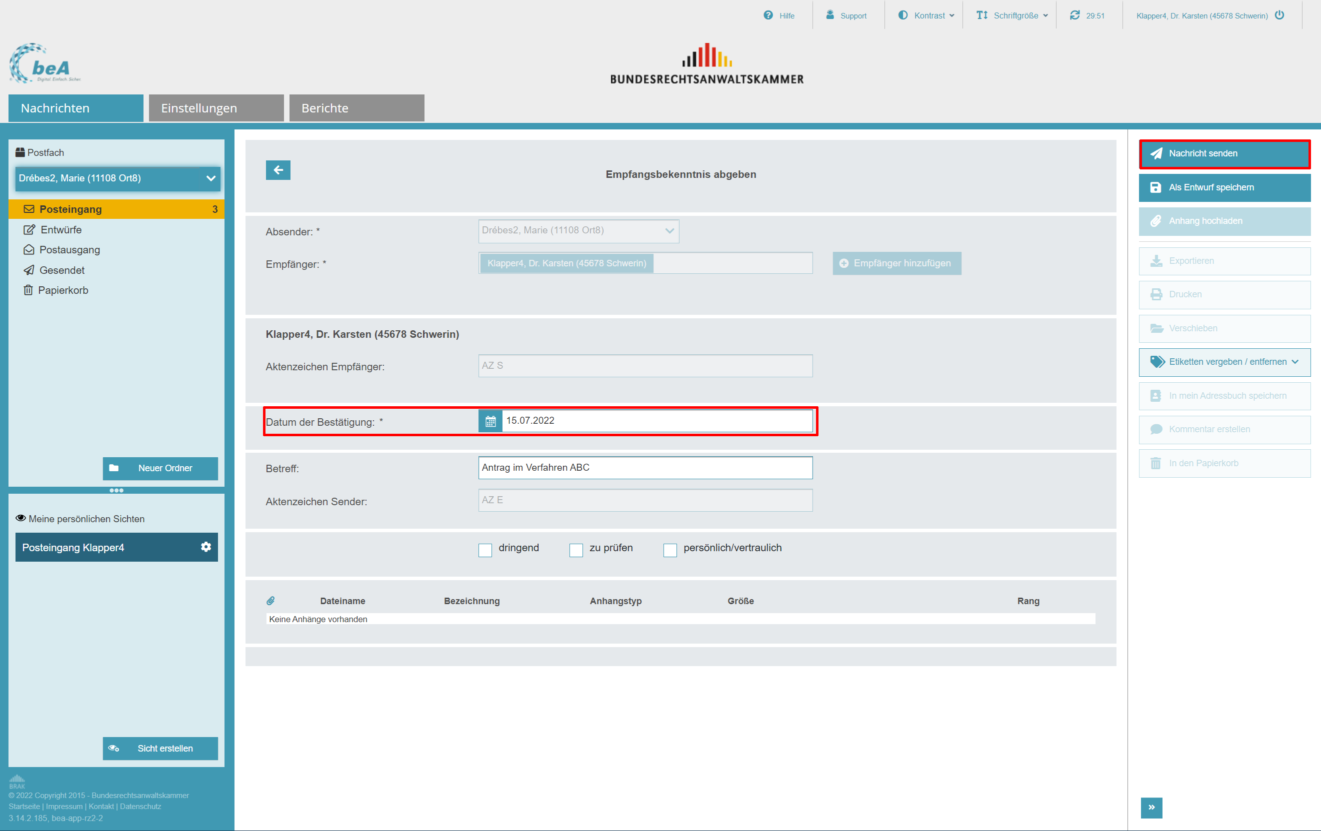 In diesem Entwurf gibt die Vertretung das „Datum der Bestätigung“ ein und wählt danach die Schaltfläche „Nachricht senden“ aus. Die Signatur des Strukturdatensatzes vor dem Versand ist nicht erforderlich und wird auch nicht angeboten, da das Recht „13 EBs signieren“ der Vertretung im Beispielfall nicht zugewiesen ist.