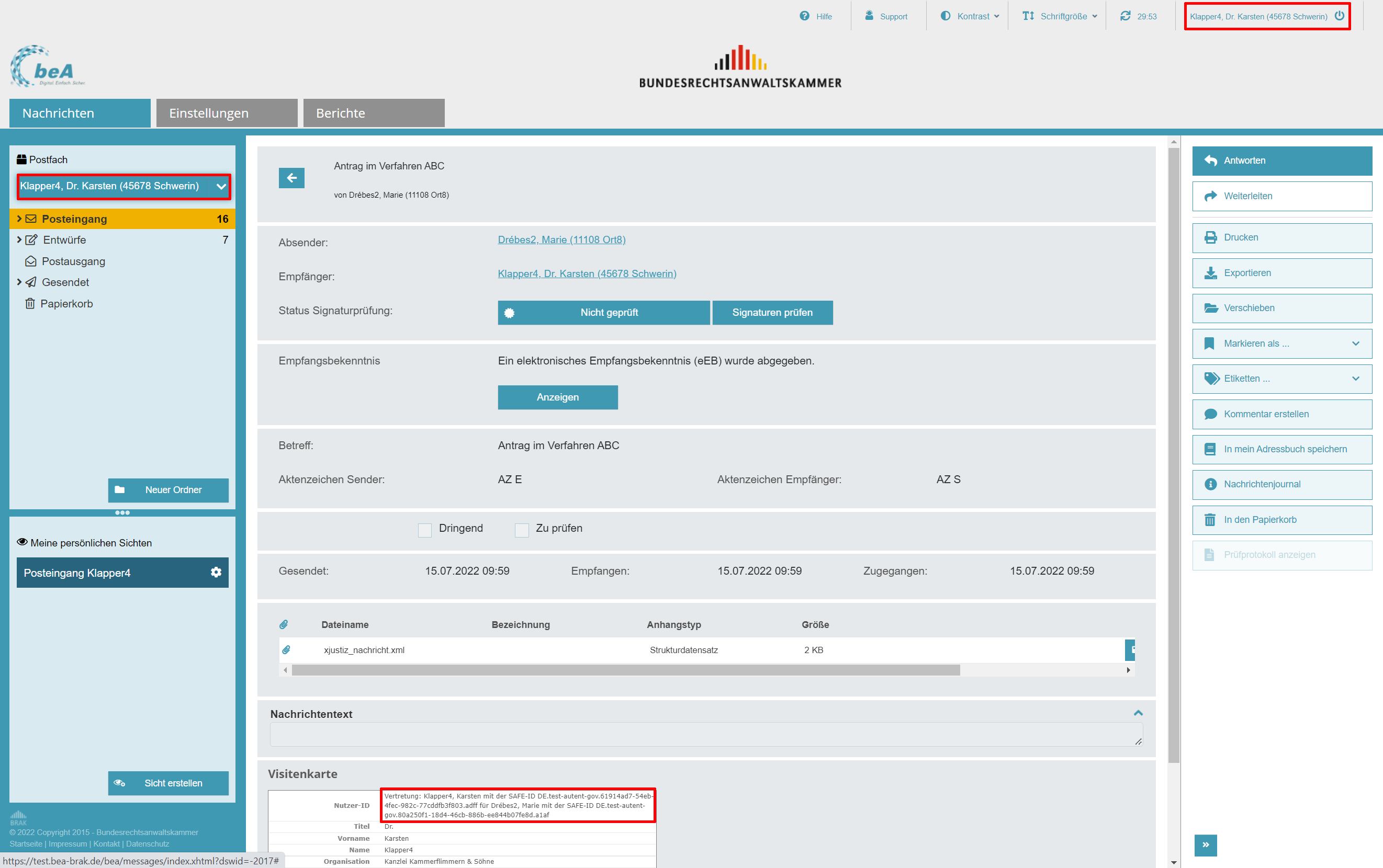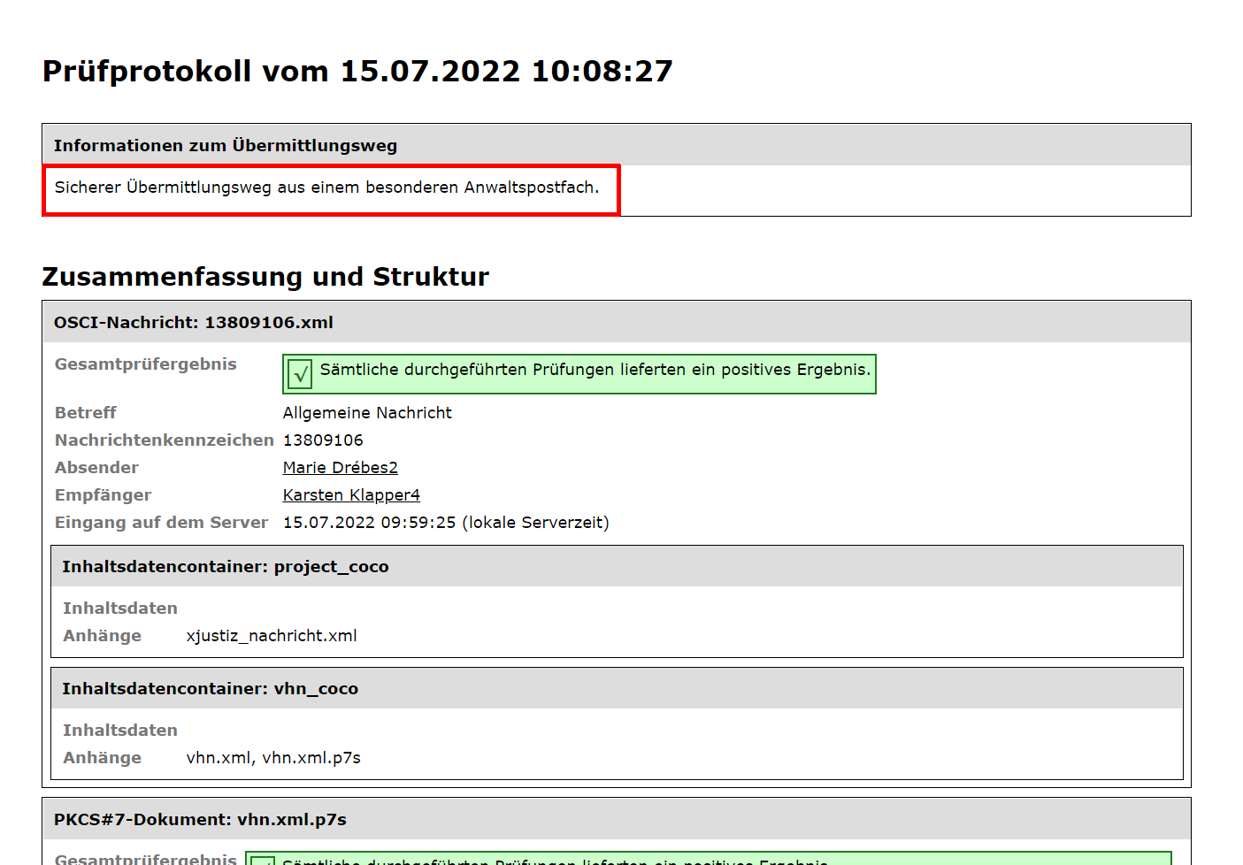Entsprechend den Erläuterungen im Beitrag „Sicherer Übermittlungsweg für Vertretungen und Zustellungsbevollmächtigte“ können Sie die Bestätigung des sicheren Übermittlungsweges im Prüfprotokoll nach Aktivierung der Schaltfläche „Signaturen prüfen“ überprüfen. In der Visitenkarte und in der Anzeige der gesendeten Nachricht wird der Versand durch die VHN-Berechtigte oder den VHN-Berechtigten ebenfalls kenntlich gemacht.
