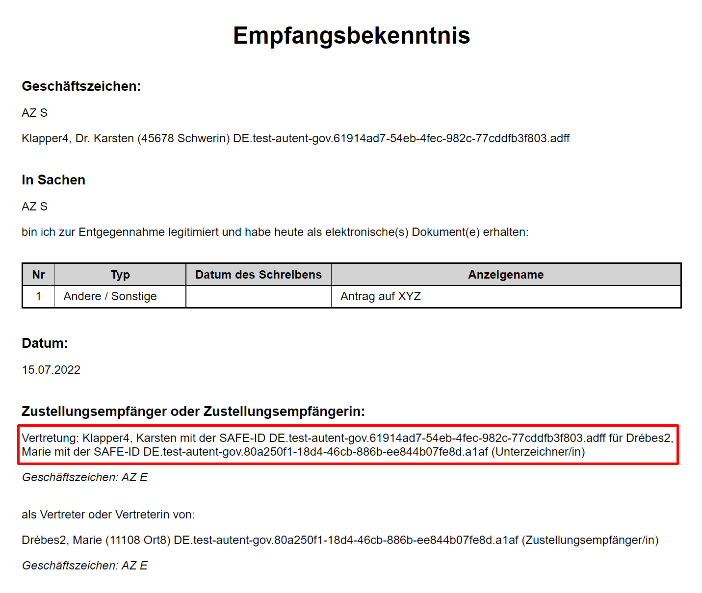 Die gezeigten Abläufe gelten entsprechend für Zustellungsbevollmächtige mit der Rolle „Zustellungsbevollmächtigter“, die eEBs aus dem Postfach der oder des von ihnen Vertretenen versenden. Auch in diesem Szenarium ist der Versand eines eEBs ohne Signatur möglich. Ebenso erfolgt die Bestätigung des sicheren Übermittlungsweges. In der Visitenkarte und in der Anzeige des elektronischen Empfangsbekenntnisses wird der Versand durch Zustellungsbevollmächtigte ebenfalls kenntlich gemacht.