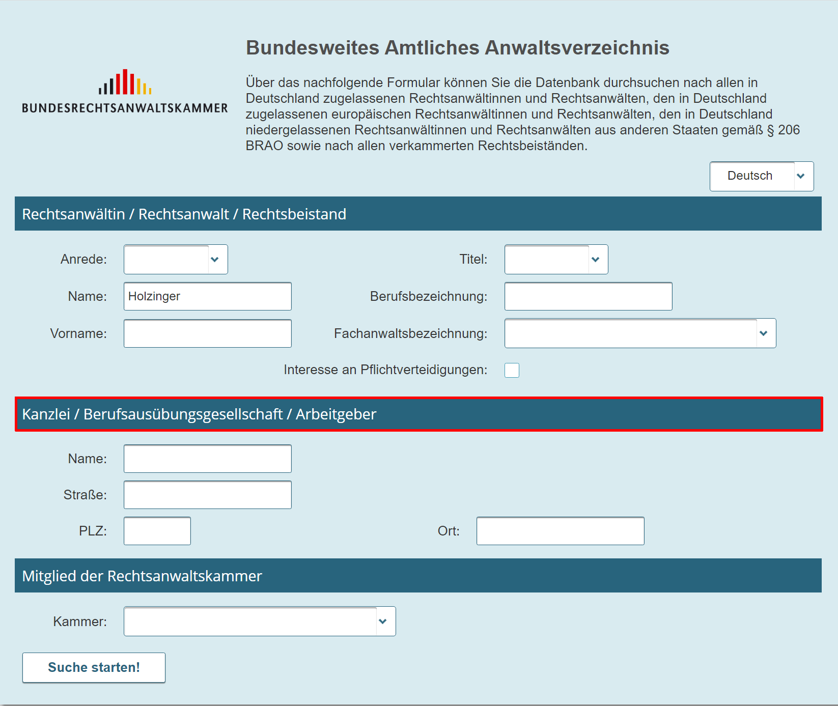 Auf der Einstiegsseite des BRAV können Sie wie bisher Ihre Suchkriterien eingeben. Ab Bereitstellung der beA-Version 3.14 können Sie auch nach einer zugelassenen Berufsausübungsgesellschaft im BRAV suchen.