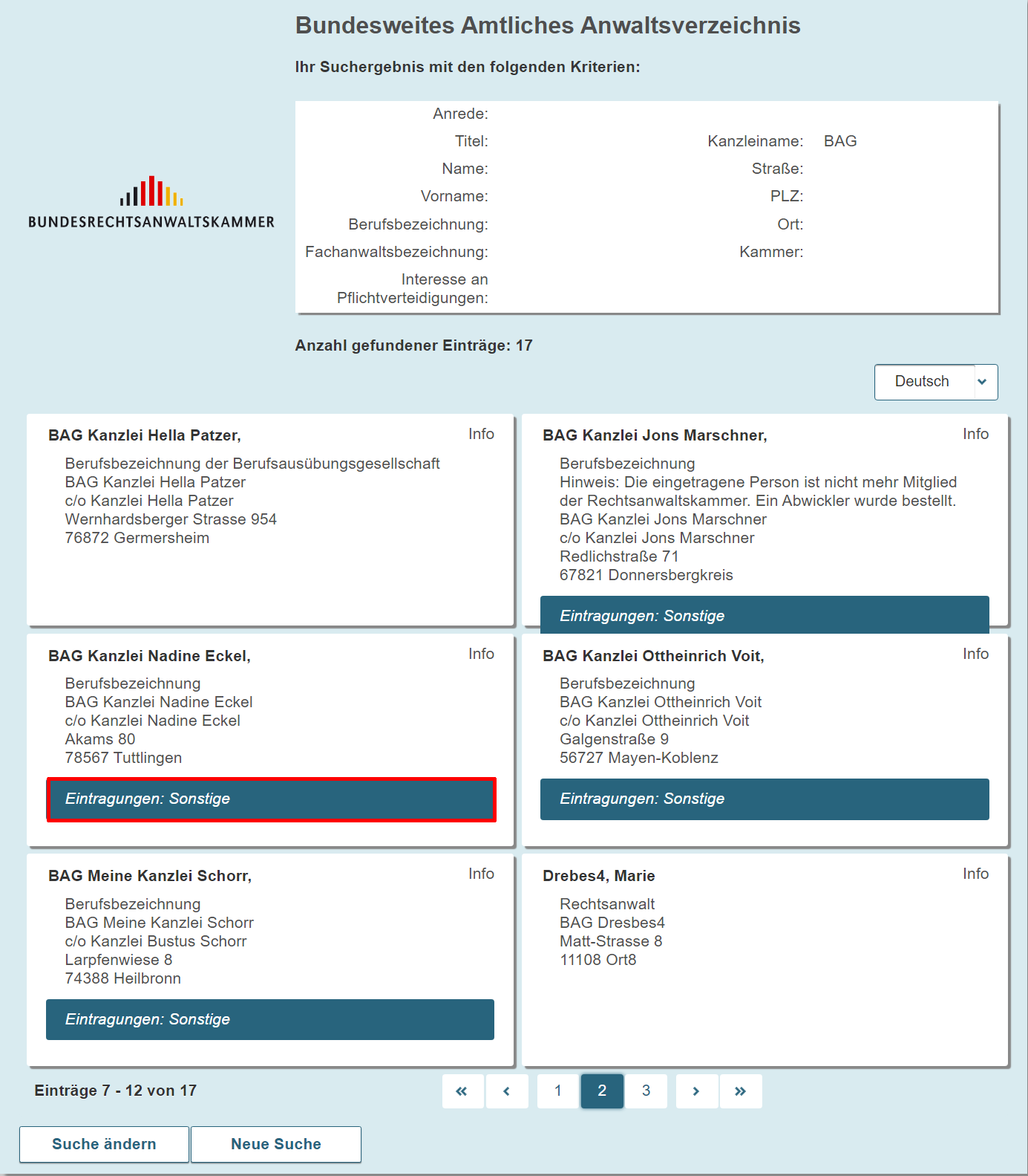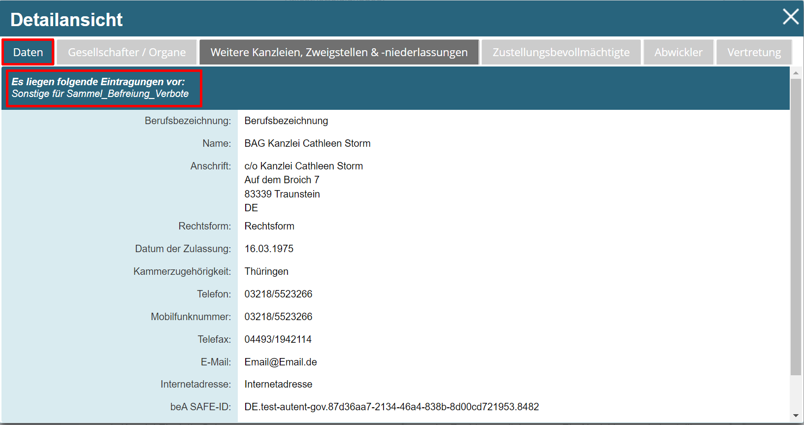 Direkt bei der Darstellung der Suchergebnisse werden etwaige Eintragungen zu Rechtsanwältinnen und Rechtsanwälten oder Berufsausübungsgesellschaften (Kanzleipflichtbefreiung, Vertretungsverbote, Berufsverbote, Tätigkeitsverbote, Sonstiges) kenntlich gemacht.
