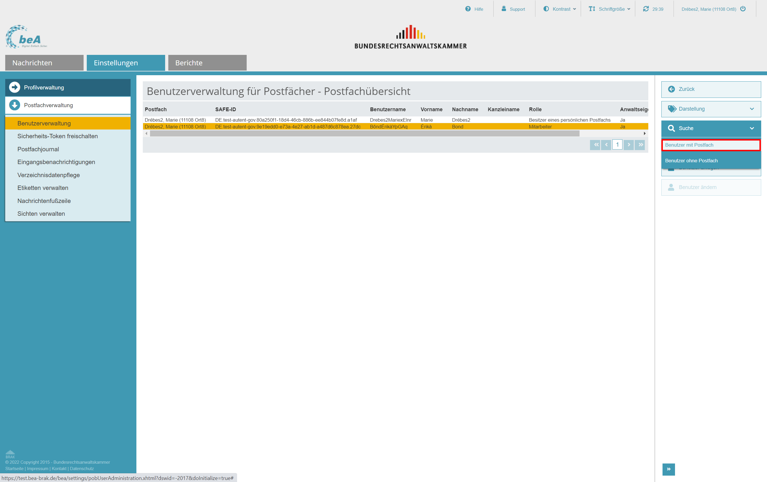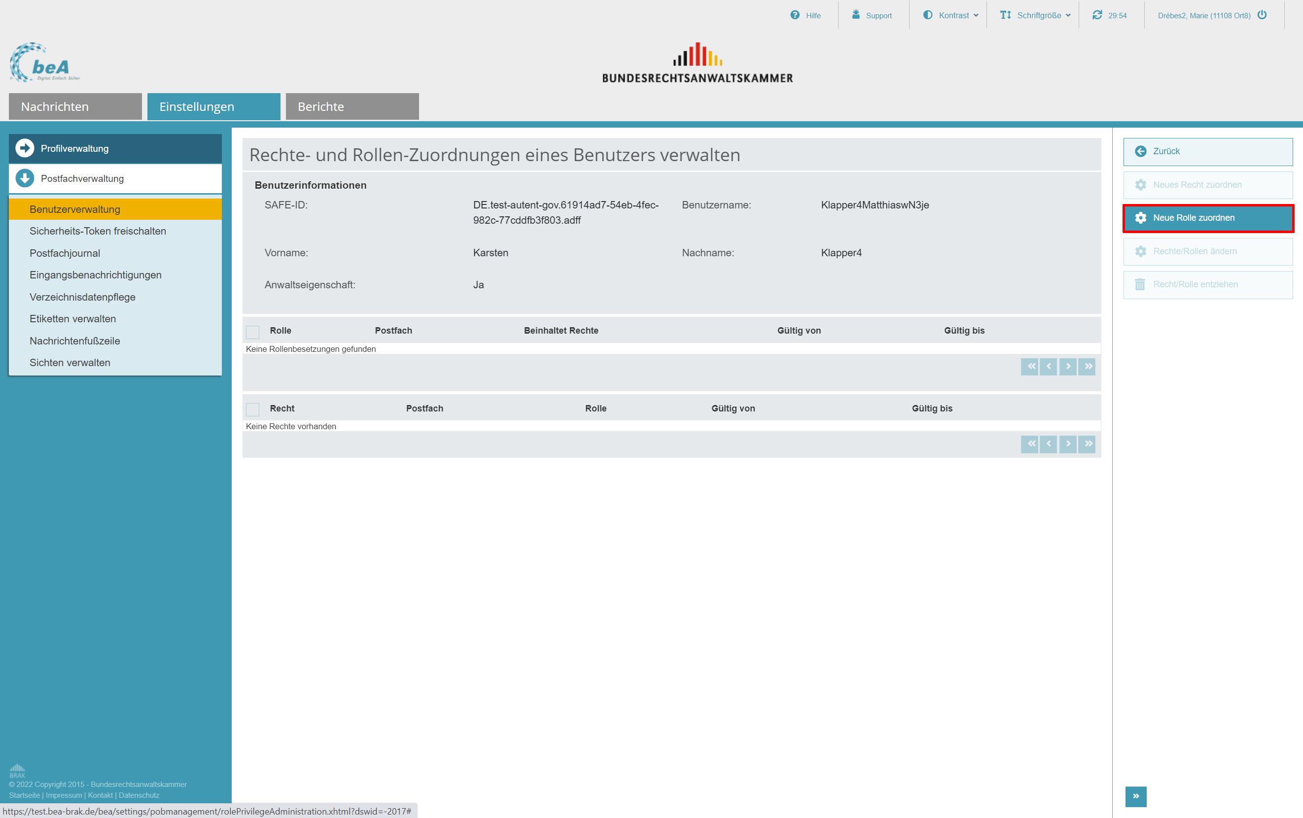 In dem nachfolgenden Beispiel ist die Postfachinhaberin oder der Postfachinhaber eines persönlichen Postfachs mit ihrer bzw. seiner beA-Karte angemeldet und hat die Benutzerverwaltung geöffnet. In einer Übersicht werden bereits vergebene Rollen angezeigt.