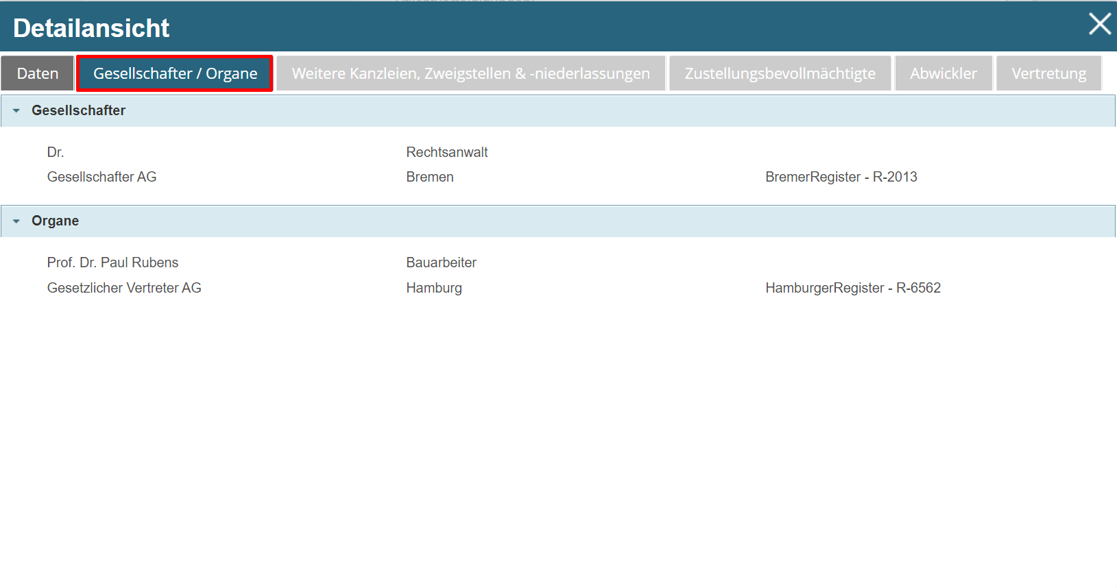 Die vertretungsberechtigten Gesellschafterinnen und Gesellschafter von rechtsfähigen Personengesellschaften sowie die zur gesetzlichen Vertretung berufenen Organe von juristischen Personen finden Sie in der Ergebnislasche „Gesellschafter/Organe“.