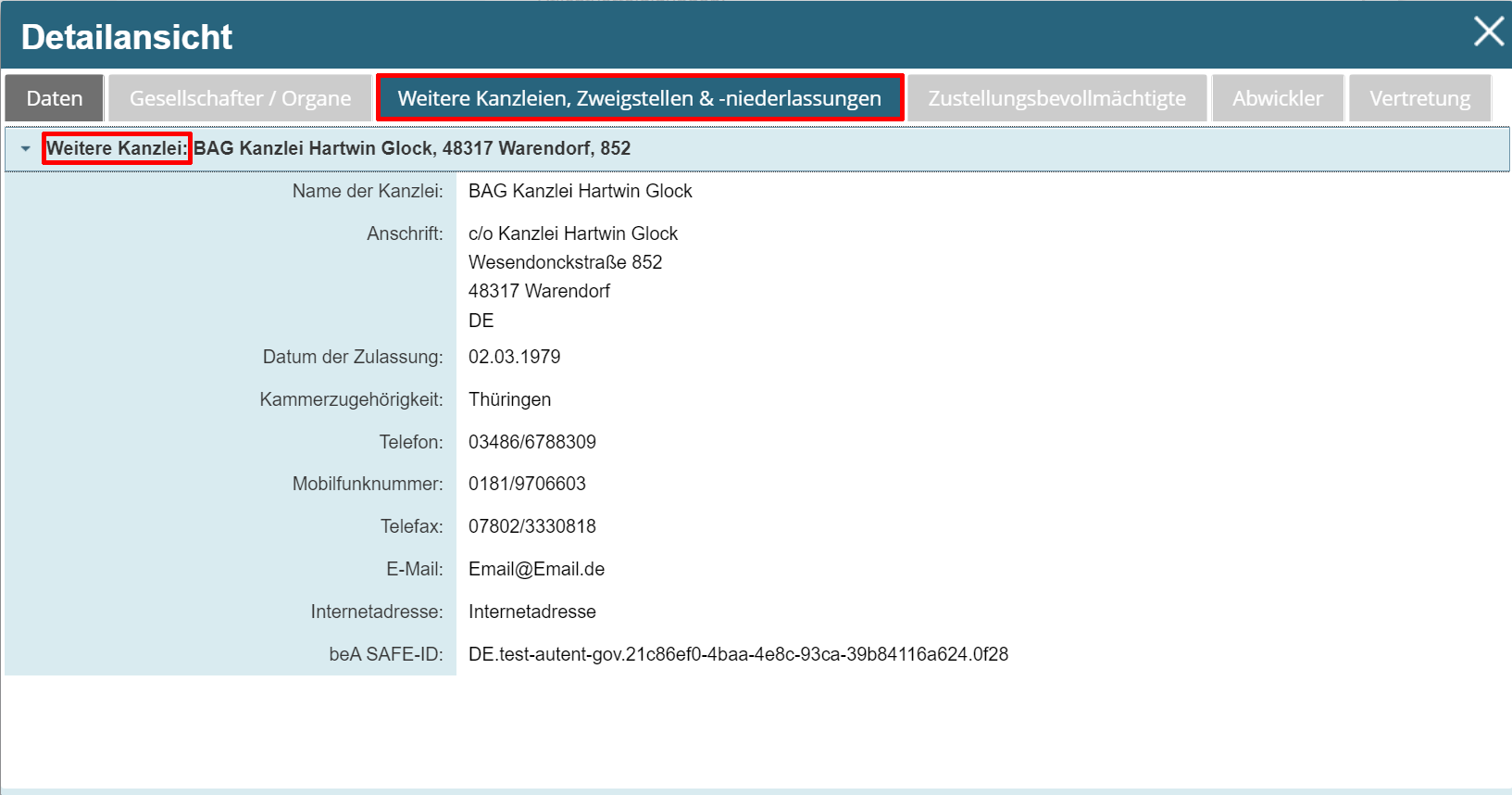 In der Ergebnislasche „Weitere Kanzleien, Zweigstellen & -niederlassungen“ finden Sie die einem Haupteintrag eines Kammermitglieds zugeordneten Daten. Hier ein Beispiel für eine weitere Kanzlei einer Berufsausübungsgesellschaft: