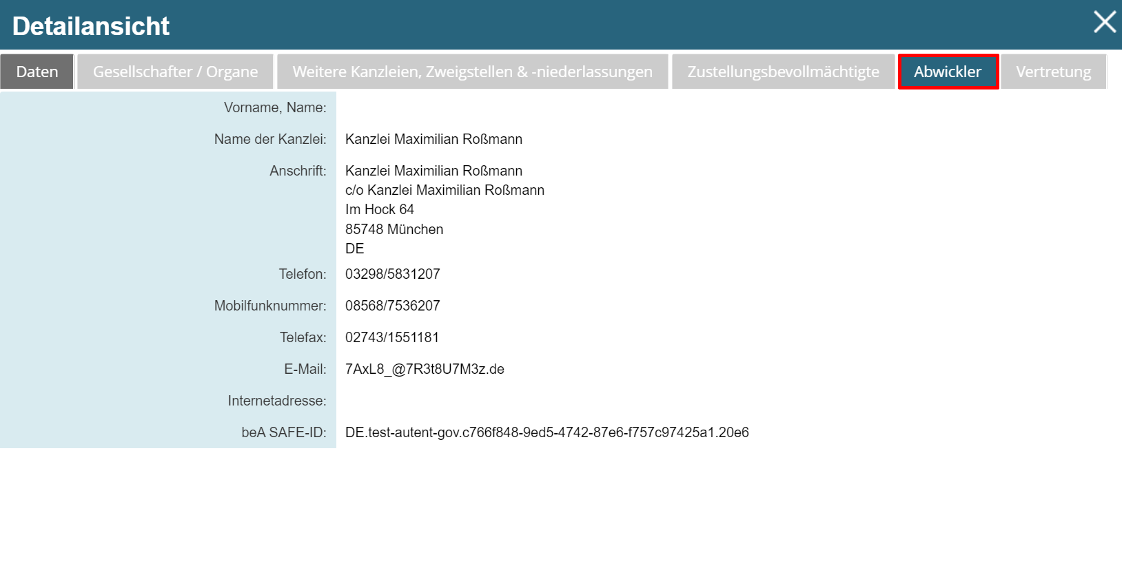 Informationen zu Zustellungsbevollmächtigen, Abwicklern und Vertretungen finden Sie in den entsprechend bezeichneten Ergebnislaschen. Eintragungen zu einer Vertretung sind nur sichtbar, wenn die Vertretung zu einem Postfach durch die zuständige Rechtsanwaltskammer bestellt wurde, nicht indes bei einer durch die Postfachinhaberin oder den Postfachinhaber selbst bestellten Vertretung. Hier ein Beispiel für einen eingetragenen Abwickler:
