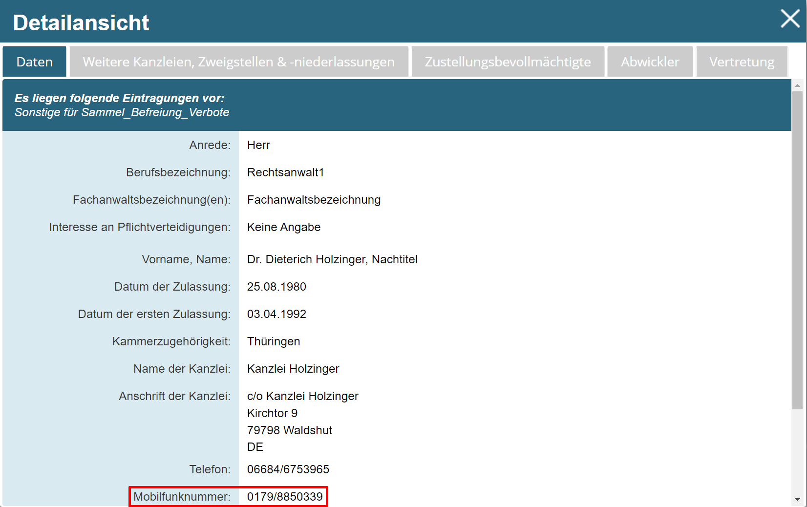 Ab der beA-Version 3.14 können auf Wunsch des Kammermitglieds auch Mobilfunknummern im BRAV angezeigt werden. Nachfolgendes Beispiel zeigt die Mobilfunknummer eines Rechtsanwalts in der Lasche „Daten“ der Detailsicht.