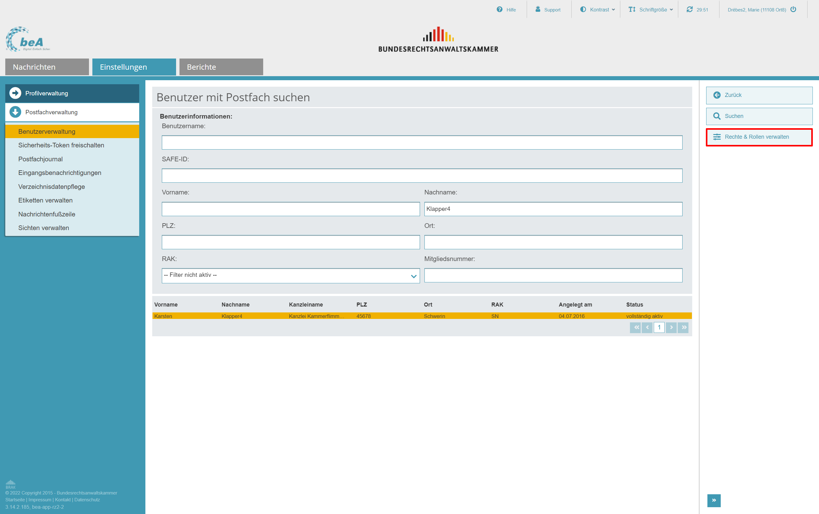 Mit der beA-Version 3.14 wurde das Rechte- und Rollenmanagement überarbeitet. Rechte können über die Zuweisung von Rollen vergeben werden. In vergebenen Rollen können optionale Rechte ergänzt und entfernt werden. Dies gilt auch für Postfächer von Berufsausübungsgesellschaften.