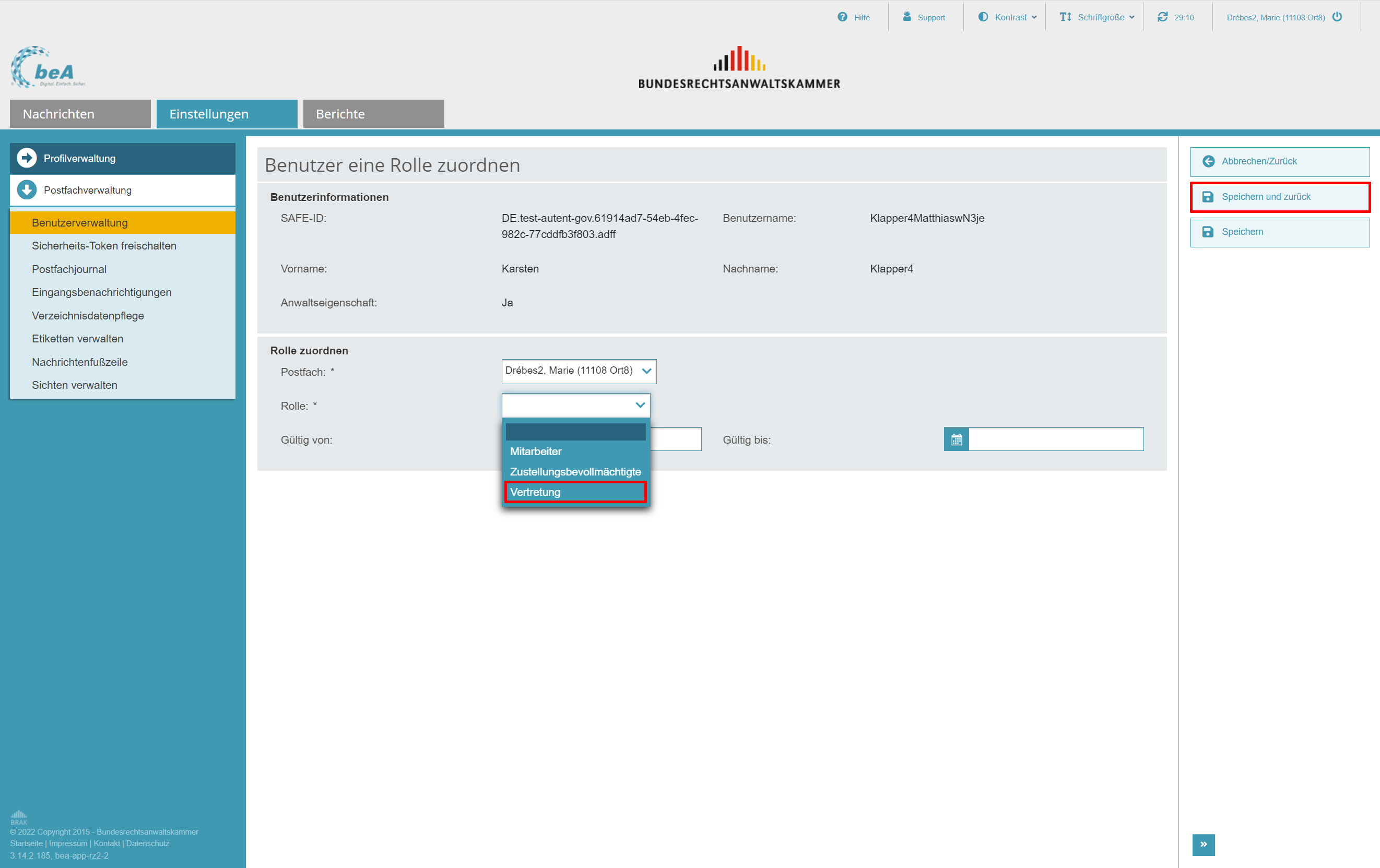 Bisher konnte in der beA-Webanwendung Benutzern die Rolle „Mitarbeiter“ in einem Postfach zugewiesen werden. Neu sind die Rollen „Zustellungsbevollmächtigter“, „Vertretung“ und „VHN-Berechtigter“.
