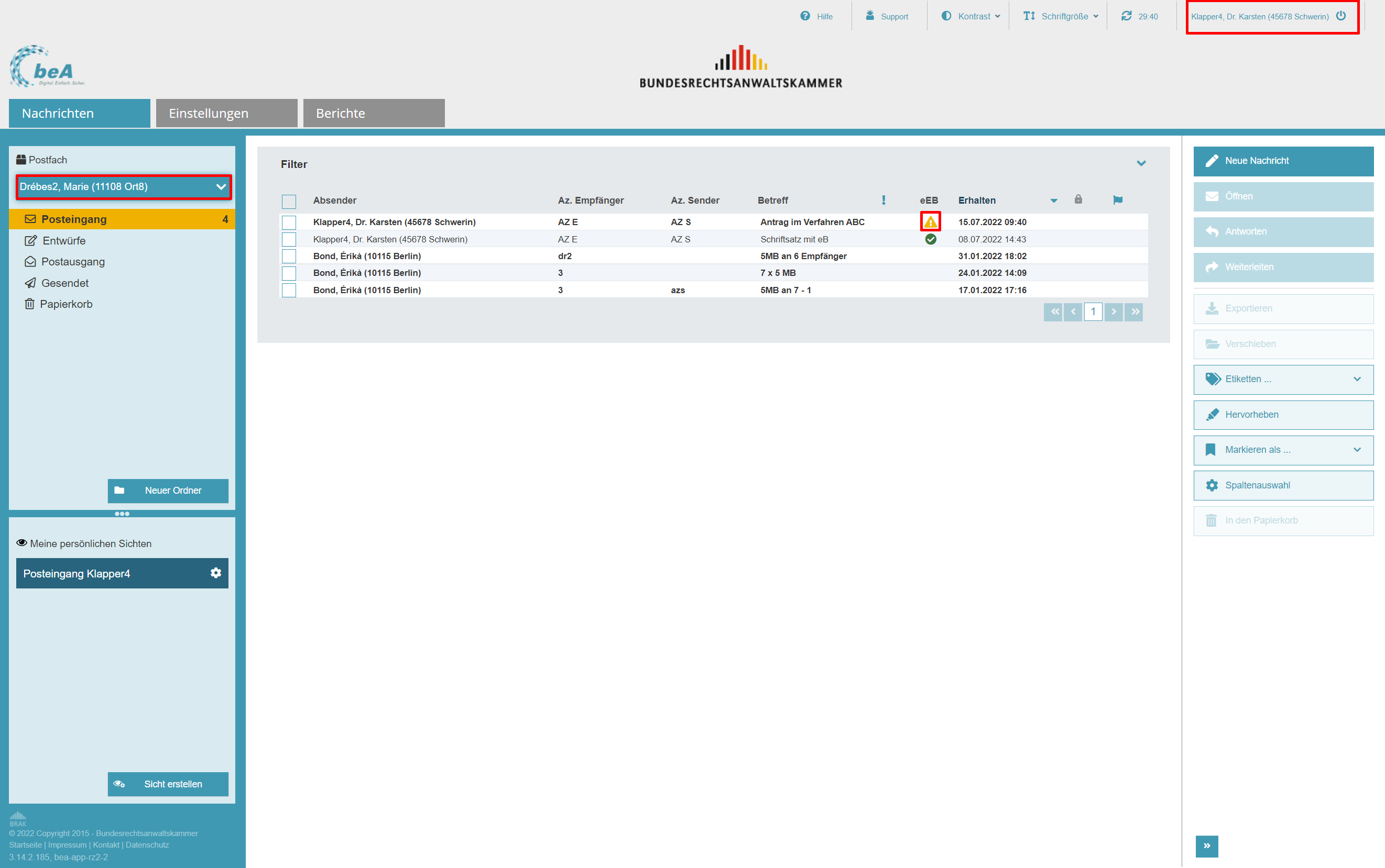 Nachfolgend zeigen wir Ihnen, wie eine angelegte Vertretung mit der Rolle „Vertretung“ im Postfach der oder des Vertretenen ein eEB über den sicheren Übermittlungsweg versenden kann. In dem gezeigten Beispiel ist die Vertretung in der beA-Webanwendung angemeldet und hat bereits das Postfach der oder des Vertretenen ausgewählt (Dropdown auf der linken Seite). Im Posteingang der oder des Vertretenen ist eine eingehende und noch unbeantwortete eEB-Anforderung (gelbes Warndreieck) sichtbar.