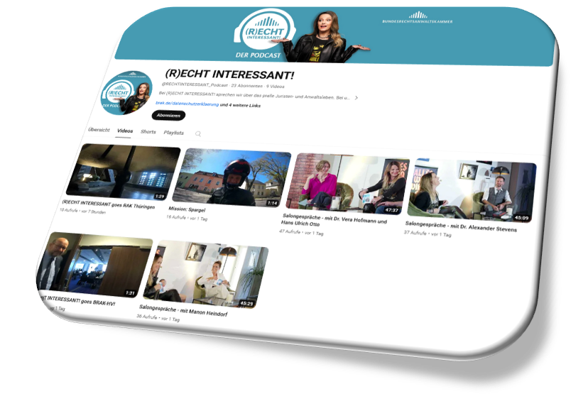 Seit Oktober 2020 veröffentlicht die BRAK die Podcast-Reihe „(R)ECHT INTERESSANT!“. Seither sind über 100 Folgen erschienen, in denen die unterschiedlichsten Kolleginnen und Kollegen zu Wort kommen und spannende Einblicke in ihren Berufsalltag und verschiedenste Tätigkeitsfelder geben. Moderiert werden die Gespräche von Pressesprecherin und Geschäftsführerin Rechtsanwältin Stephanie Beyrich, die die Podcast-Ausgaben parallel auf Instagram bewirbt und seit gestern mit einem eigenen YouTube-Channel vertreten ist. Zu sehen sind Videos von der Live-Aufzeichnung anlässlich der 100. Jubiläumsfolge, den „Salongespräche“ in den Räumen der BRAK vor Publikum, und Videos mit einem Blick hinter die Kulissen der BRAK-Hauptversammlung und von Rechtsanwaltskammern. Außerdem kann man einen Blick auf das erhaschen, was der Host des Podcasts, Steffi Beyrich, so unternimmt, wenn sie nicht gerade in einer Aufzeichnung steckt. Highlight des Kanals sind natürlich die Live-Jubiläums-Folgen! Die BRAK freut sich natürlich über zahlreiche Abos, Likes und nette Kommentare.